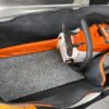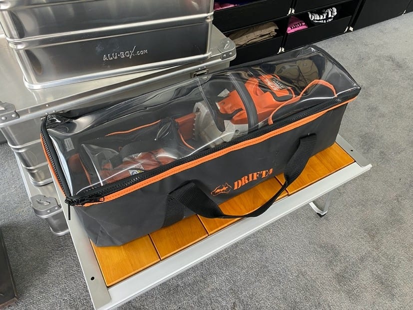 Great way how to store away your chainsaw bag. The main bag has an internal pocket divided into two parts. One for a spare chain the other to store the oil away. The base is supported by marine carpet.