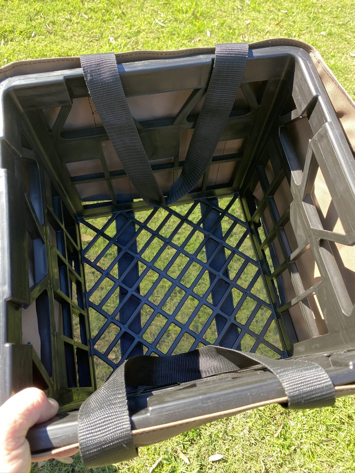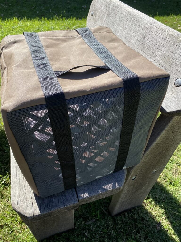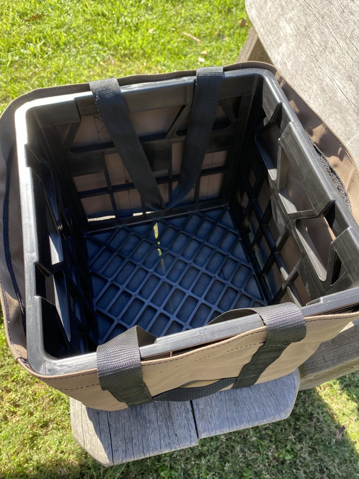 Bag to suite a milk crate. No lid. Great for firewood, tools etc. Longer handles for easy carrying.