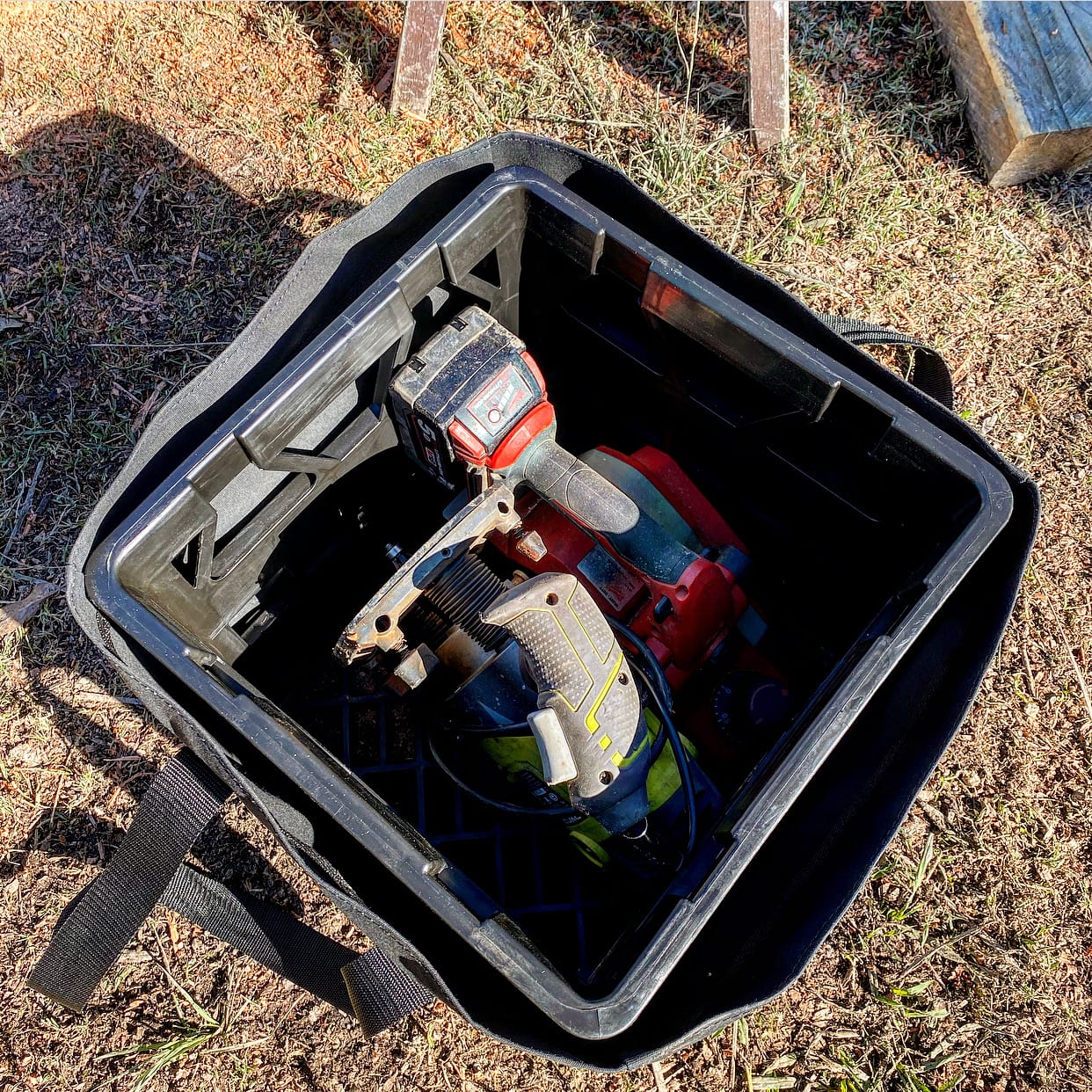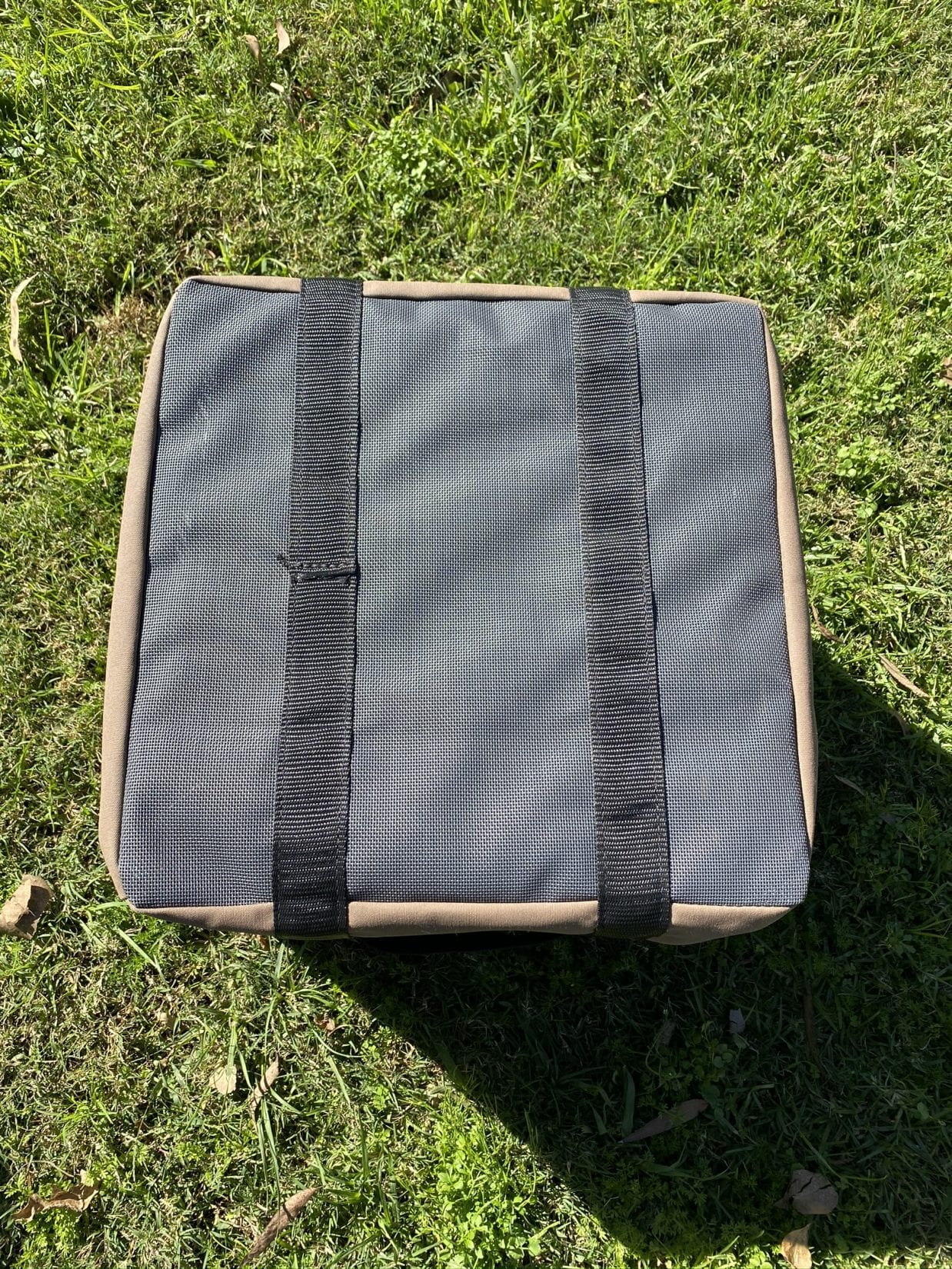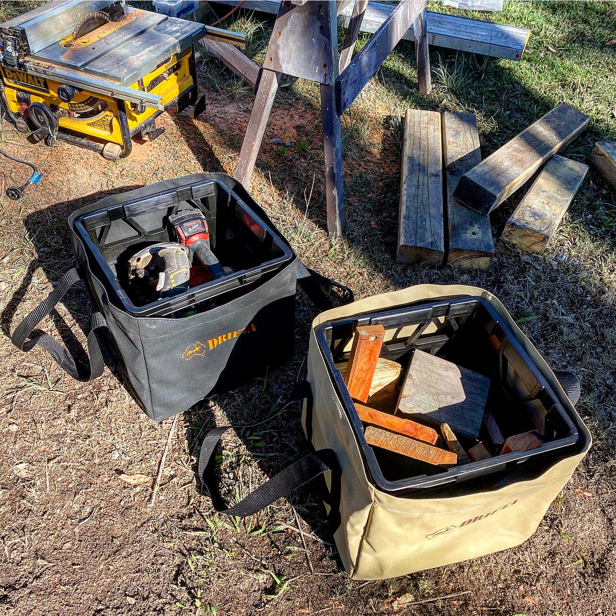 Bag to suite a milk crate. No lid. Great for firewood, tools etc. Longer handles for easy carrying.