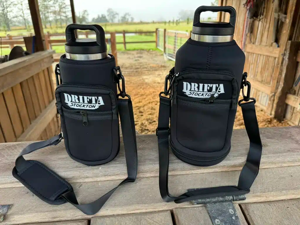 The Drifta Stockton Neopren coves provide even more insulation for our water bottle range. They come in 3 versions to suite all 3 sizes of Water bottles. All come with an shoulder strap so perfect for hiking and  2x front pocket to fit an phone and smaller items. The 2L size version comes with a side hand hadle. With the 3.8l version you get also a side mesh pocket.