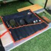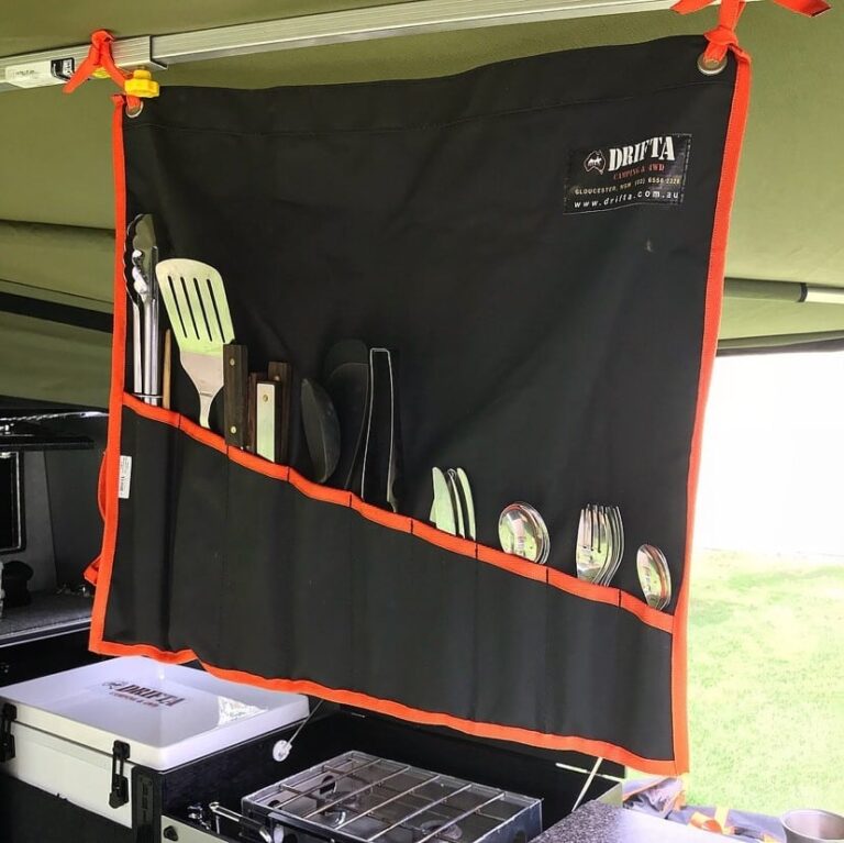 Made out of Australian canvas and include 9 pockets. In the top corners you have 2 eyelets so you can hang your canvas roll on two nails or use a rope to attach them to poles etc. Includes red rope.